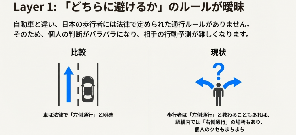 車は左側通行と決まっていますが、駅構内や商店街では「どちらを歩くべきか」がきちんと決められていません。