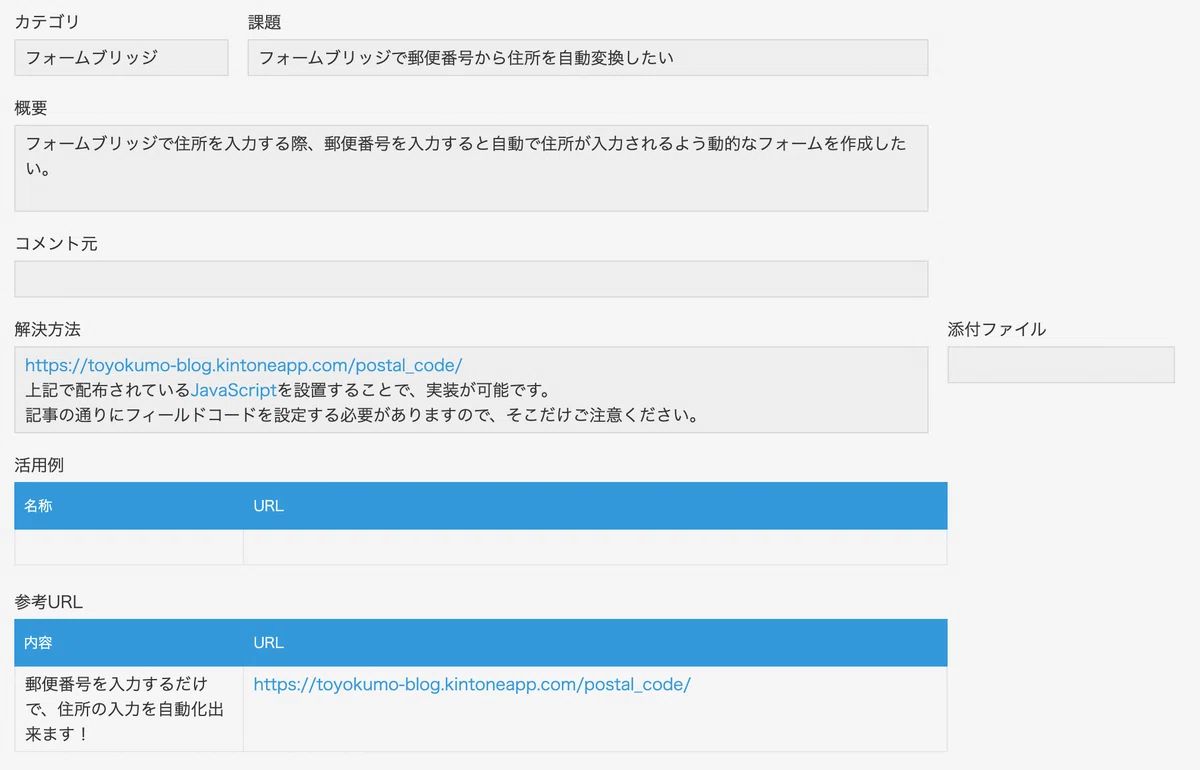 アプリ内には、問い合わせに対する回答内容を登録できるようにします。いつ、誰が、どのように回答したのか、またその際に参考にしたサイトや記事があればそれについても登録しておくと、後で振り返った時に出処を再検索せずに済みます。