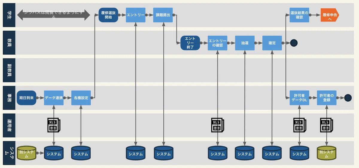 この時、上部に組織外のアクターを並べ、その下に庁内の担当者を並べ、一番下に必ず「システム」のレーンを置きます。