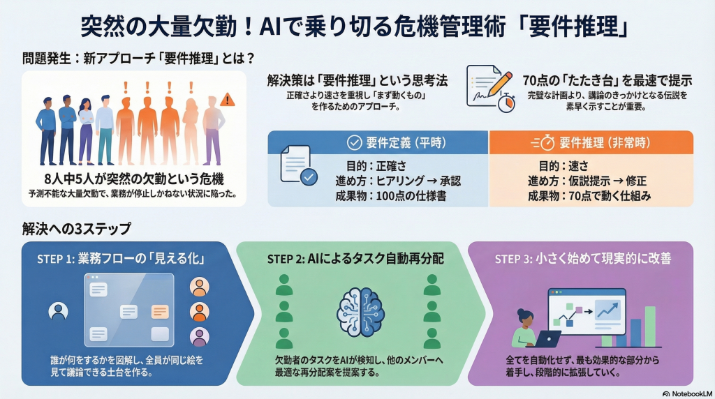 3回にわたるポッドキャストでは、突発的な大量欠勤をきっかけに、“要件推理”という独自の思考法で状況を整理し、業務フローの可視化からAIによるタスク再分配のプロトタイプまで、一気通貫で形にしていきました。