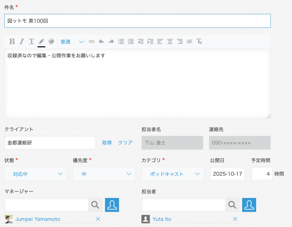 件名・概要・担当者・優先度・カテゴリ・公開日・想定工数・リンク。