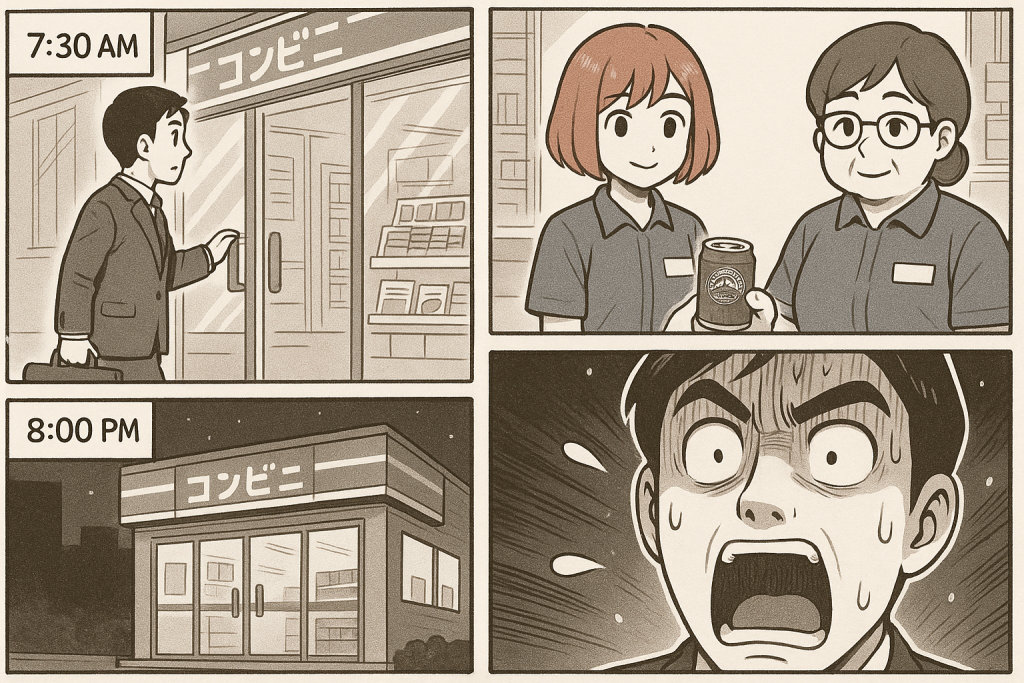 日本のコンビニ業界では人材不足が常態化しており、特に深夜・早朝のシフト確保が難しいという話もあります。そのため“早朝から夕方・夜まで”を通して同じ人がカバーするような店長裁量のシフトが組まれている可能性も。