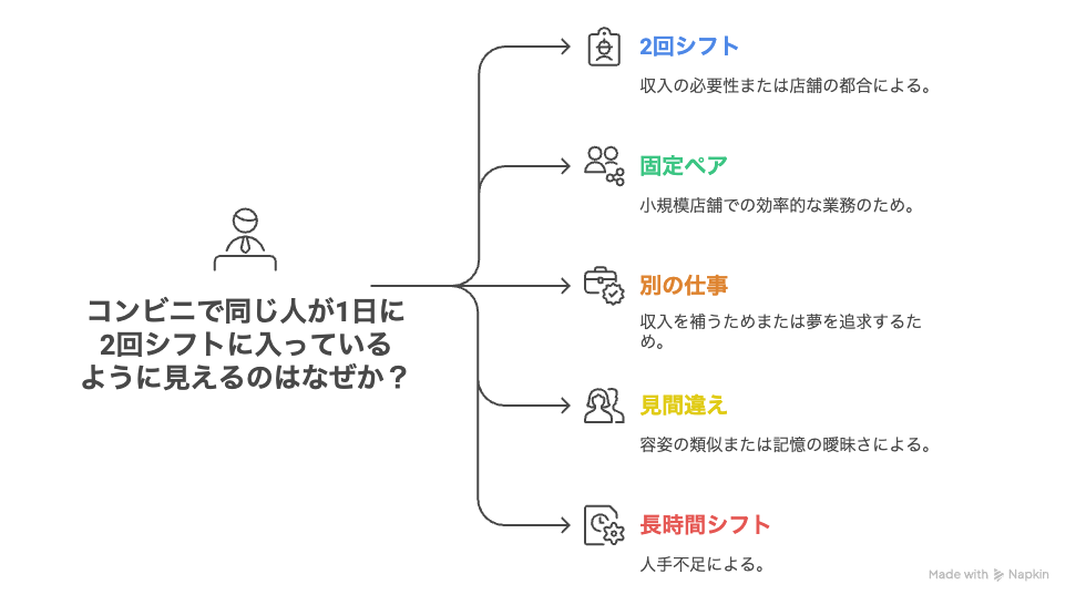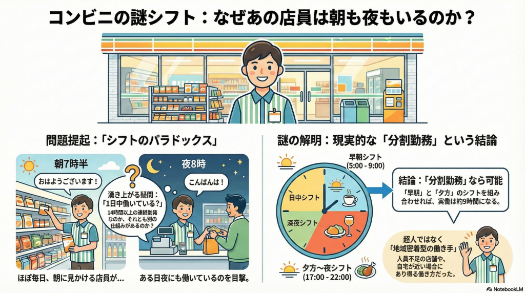 日本のコンビニ業界では人材不足が常態化しており、特に深夜・早朝のシフト確保が難しいという話もあります。そのため“早朝から夕方・夜まで”を通して同じ人がカバーするような店長裁量のシフトが組まれている可能性も。