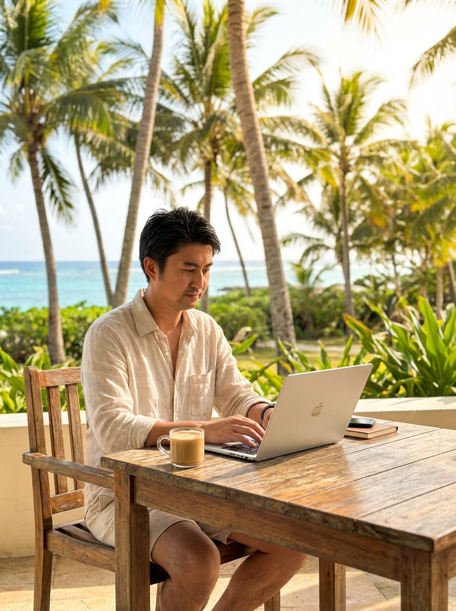 The person is a remote worker who can work anywhere with a laptop.