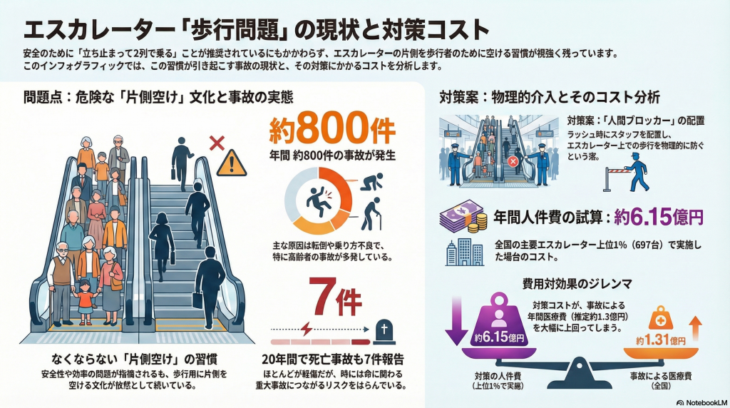 一方でエスカレーター事故は年間800件くらい起きていて、医療費は約1億3000万円。