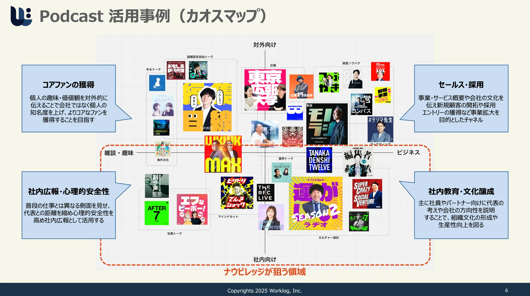 「実はリクライブさんのPodcastをテーマとターゲットでカオスマップを作成したんです。その結果社内向けのPodcastが多かったんです。今までの#デジマ先生は社外向けだったと思うんです。なので、今度は社内向けにして、今村さんのいないところでも、考え方やマインドを社内に浸透させられるのではないかと」