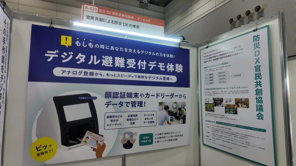 ワークログが参加したのは、防災DX官民共創協議会(BDX)・デジタル庁の「官民共創による防災DXの推進」ブース。マイナンバーカードを活用した避難者状況把握の取組として、能登半島地震・奥能登豪雨でも使用した被災者アセスメント管理システム”Worklog”を提供し、マイナンバーカードから基本4情報(氏名・住所・生年月日・性別)を読取り、避難所にチェックインする体験を展示しました。