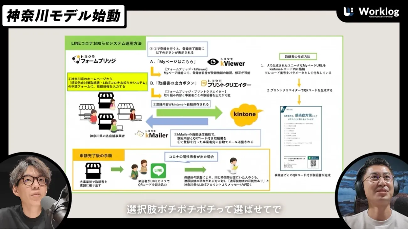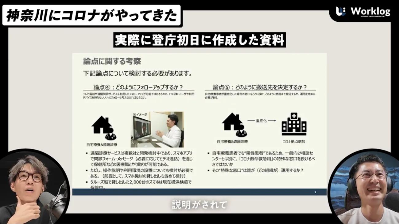 そんなワークログの転機となったのが、2020年新型コロナウイルスの混乱が国内で広がり始めた時期。神奈川県の対策本部から突然声がかかり、資料作成から始まった支援は、のちに「神奈川モデル」と呼ばれる対策の土台づくりへと発展します。