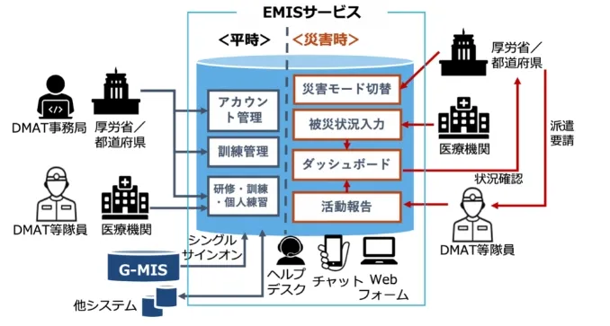 EMISサービスが持つ機能は、平時においては医療機関情報やDMAT等の隊員資格の更新等を整えつつ、災害に備えての研修や訓練を実施します。災害時にはモードが切り替わり、医療機関の被災情報報告を基に行政がDMAT等の隊員を派遣し、DMAT等の隊員が災害現場での活動を報告し、それらの最新の状況が全ての関係者にオンタイムで共有され、意思決定をサポートします。