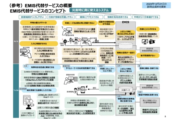本業務は、保守性や拡張性、他システムとの連携基盤を備えたEMISのシステムとその円滑な運用を支えるサービスの提供を通じて、災害発生時におけるDMAT等や医療機関の円滑で迅速な対応の実現に寄与します。