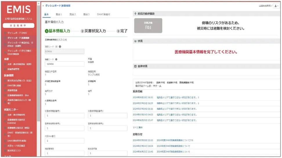 災害医療に利用されるEMIS(広域災害・救急医療情報システム)は、災害時にDMAT(災害派遣医療チーム)や救護班等、医療機関、厚生労働省や都道府県が迅速かつ適切に各種情報(医療機関の被災状況、災害派遣医療チーム・救護班の活動情報、医療搬送対象患者情報など)を集約のうえ情報共有を行い、効果的な医療対応を行うための調整に利用される我が国の災害時医療対応の要となるシステムです。